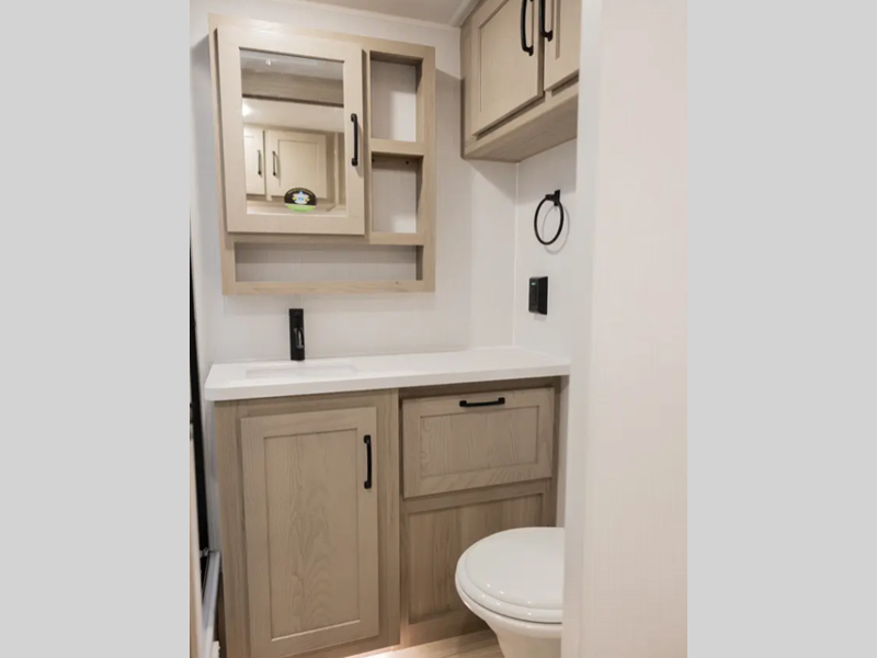 Each model is constructed with a fully laminated walkable roof, 6-sided full-aluminum frame, and a fiberglass front cap with Clear Coat for added protection. You will appreciate the slam baggage doors and 200W solar panel outside, plus there is a Climate Protection Package for better insulation. Inside, you'll love the solid surface countertops, roller shades, and soft close roller bearing drawers.