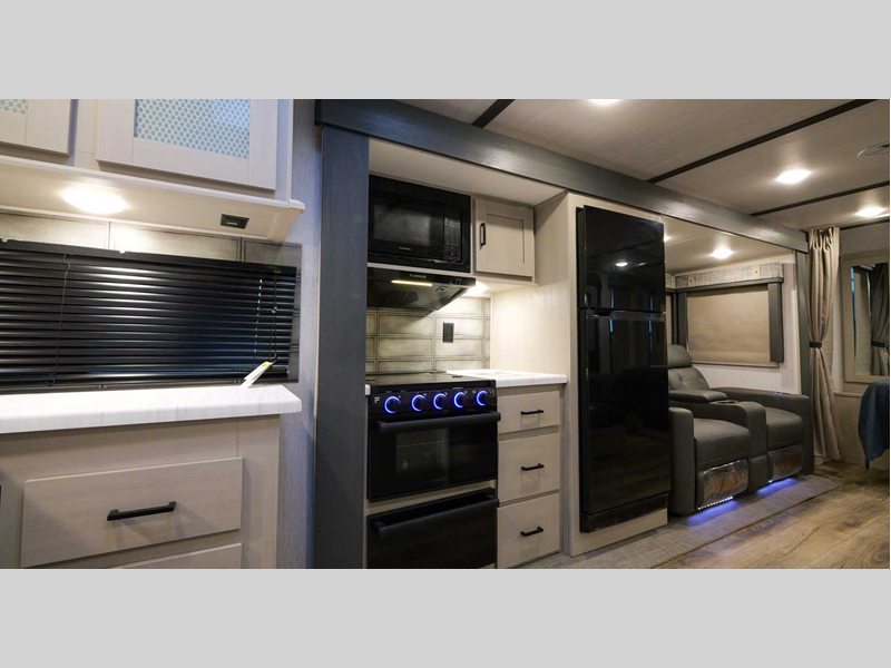 Each model is built with laminated "Aluma Frame" sidewalls and floor with block foam insulation for added durability. There is a power tongue jack with an LED docking light, along with an outside shower, and an extra large pass-thru storage for camp gear. You'll also enjoy the included Elevated Value Package that features conveniences such as square windows with built-in shades, 60K BTU On-Demand tankless water heater, and Maxxis radial tires.